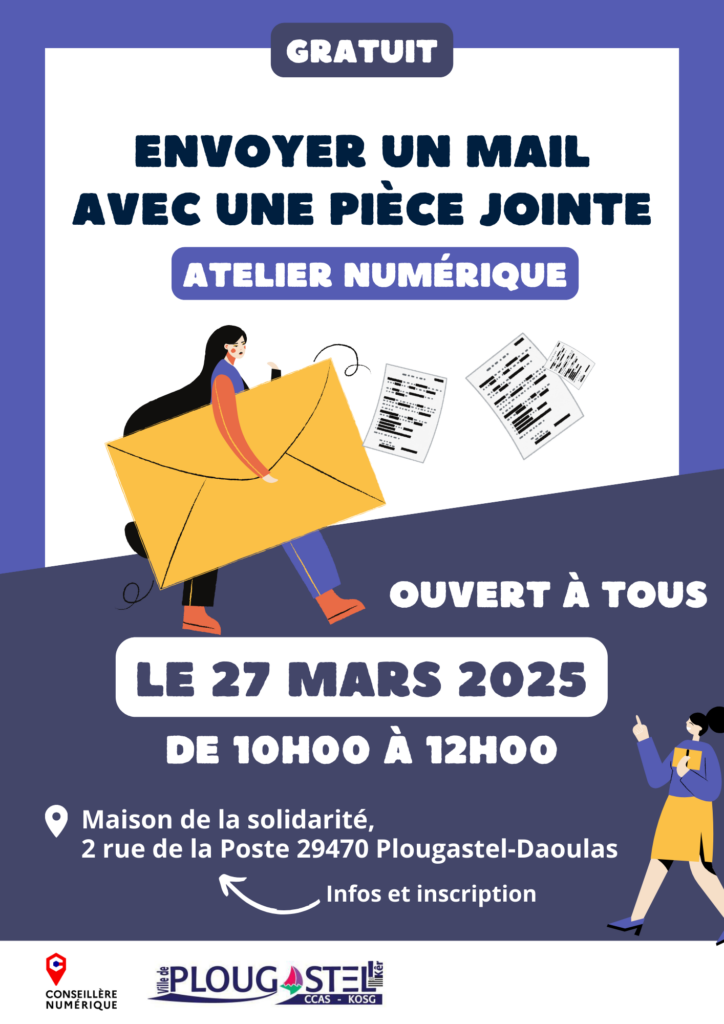 Comment envoyer un mail avec une pièce jointe ? Pendant cet atelier nous verrons ensemble comment utiliser une boite mail, pour quelle utilisation, quelle sécurité… et comment transmettre un document ou autre en pièce jointe. Le 27 mars de 10h à 11h30 à la Maison de la solidarité.