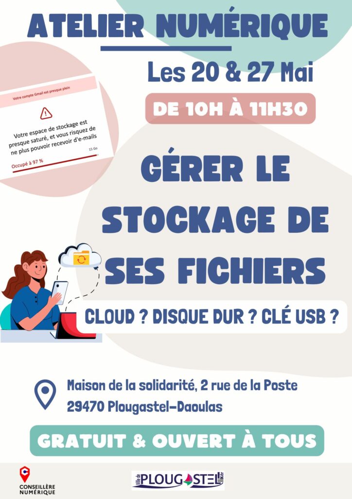 les 20 et 27 mai de 10h à 11h30 à la maison de la solidarité : gérer le stockage de ses fichiers (cloud, disque dur, clé USB…).
