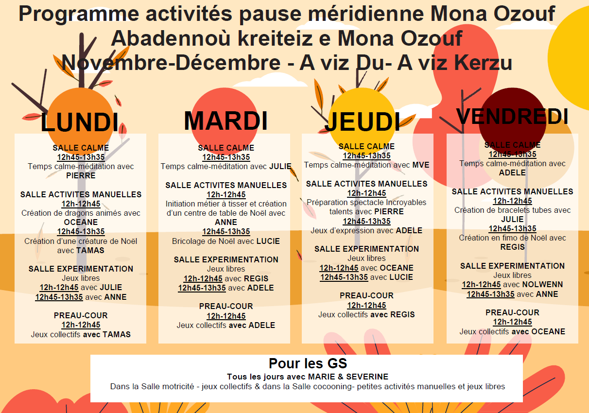 Vous pouvez joindre l’accueil périscolaire du groupe scolaire de Mona Ozouf et le centre de loisirs des mercredis de Mona Ozouf au 02 90 39 61 40.